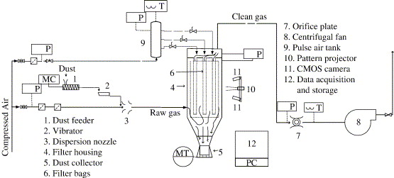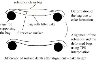 A pilot scale jet pulsed bag filter test facility is operated at conditions similar to those of the industrial bag filters. The facility is equipped with a stereo vision based optical system for in-situ cake height distribution measurements on the bag filter surface. Experimental data are presented and data evaluation procedures are discussed to elaborate the features of the measuring system.