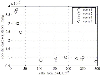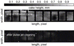 The analysis of residual cake patches shows a large number of small sized cake patches and a few large sized cake patches on the filter surface. The cake patch size increases with the cake formation. The fractal analysis of patches boundary indicates preferential cake formation at the boundary of the residual cake patches shortly after regeneration.