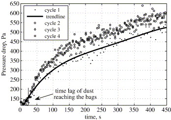 The results show that the cake height distribution becomes narrower towards the end of filtration cycles. A steep pressure drop rise is observed at the start of a filtration cycle in the absence of re-attachment and a non-uniform bag cleaning, which may be attributed to different cake properties. The specific cake resistance remains constant over the linear part of the pressure drop curve indicating a non-compressible cake formation.